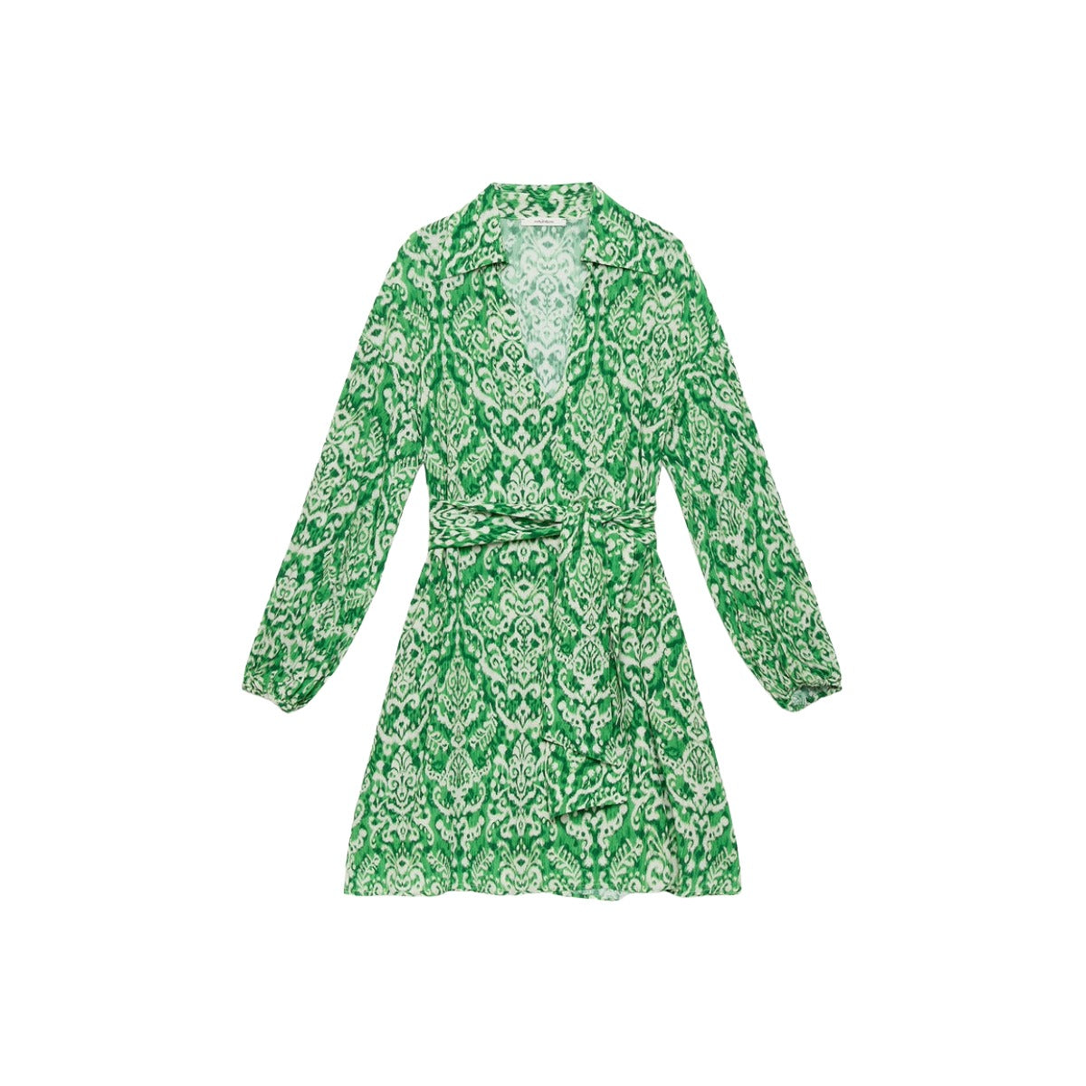 Knee-length dress with a shirt collar, caftan opening, and a sash at the waist. The wide sleeves, gathered at the cuffs with elastic, can be adjusted to create a balloon effect. Made from fluid Ikat-print viscose with a vertical embossed pattern, which adds movement and a naturally imperfect texture. A garment with a relaxed and contemporary allure, perfect for daywear or travel, to be paired with flat sandals and natural accessories.