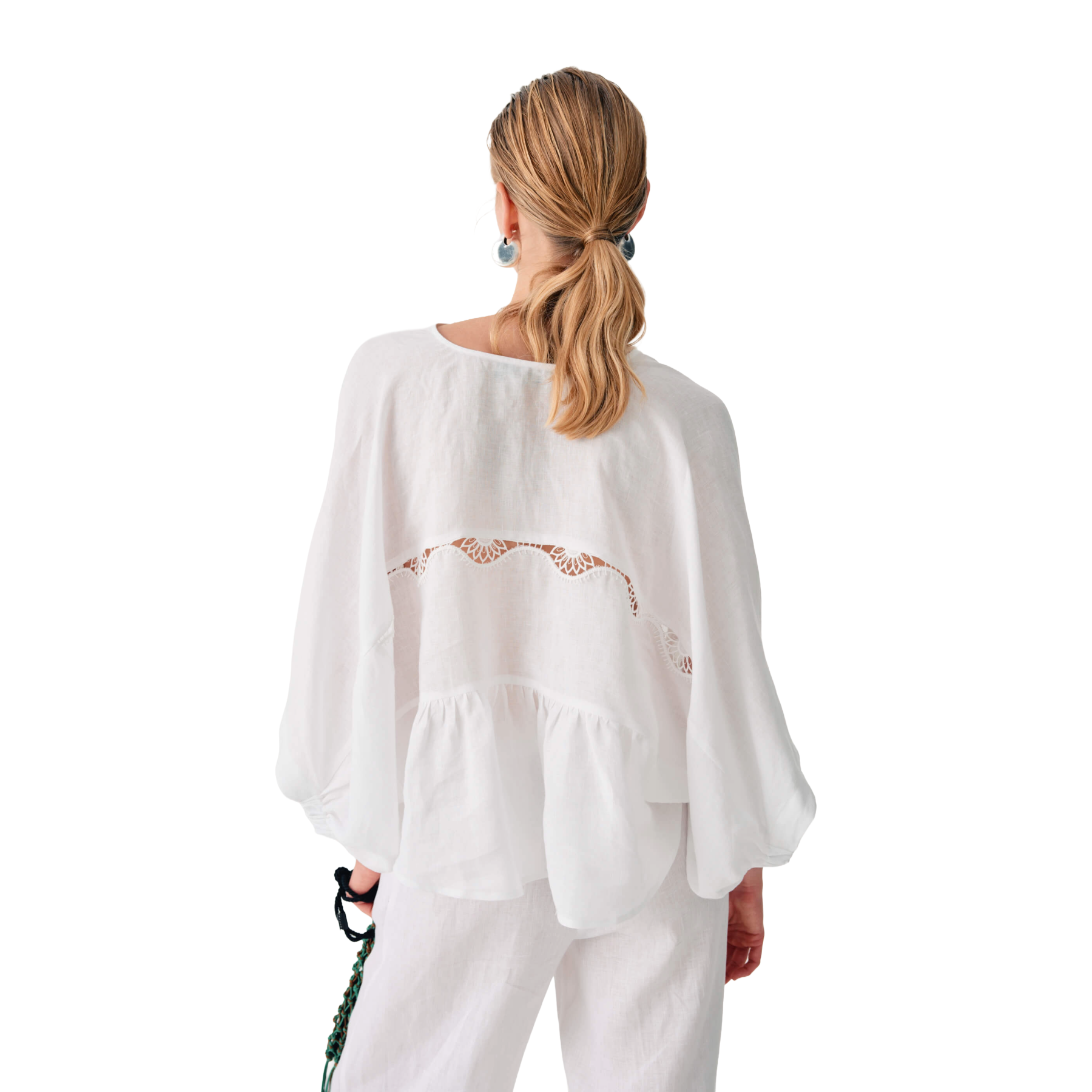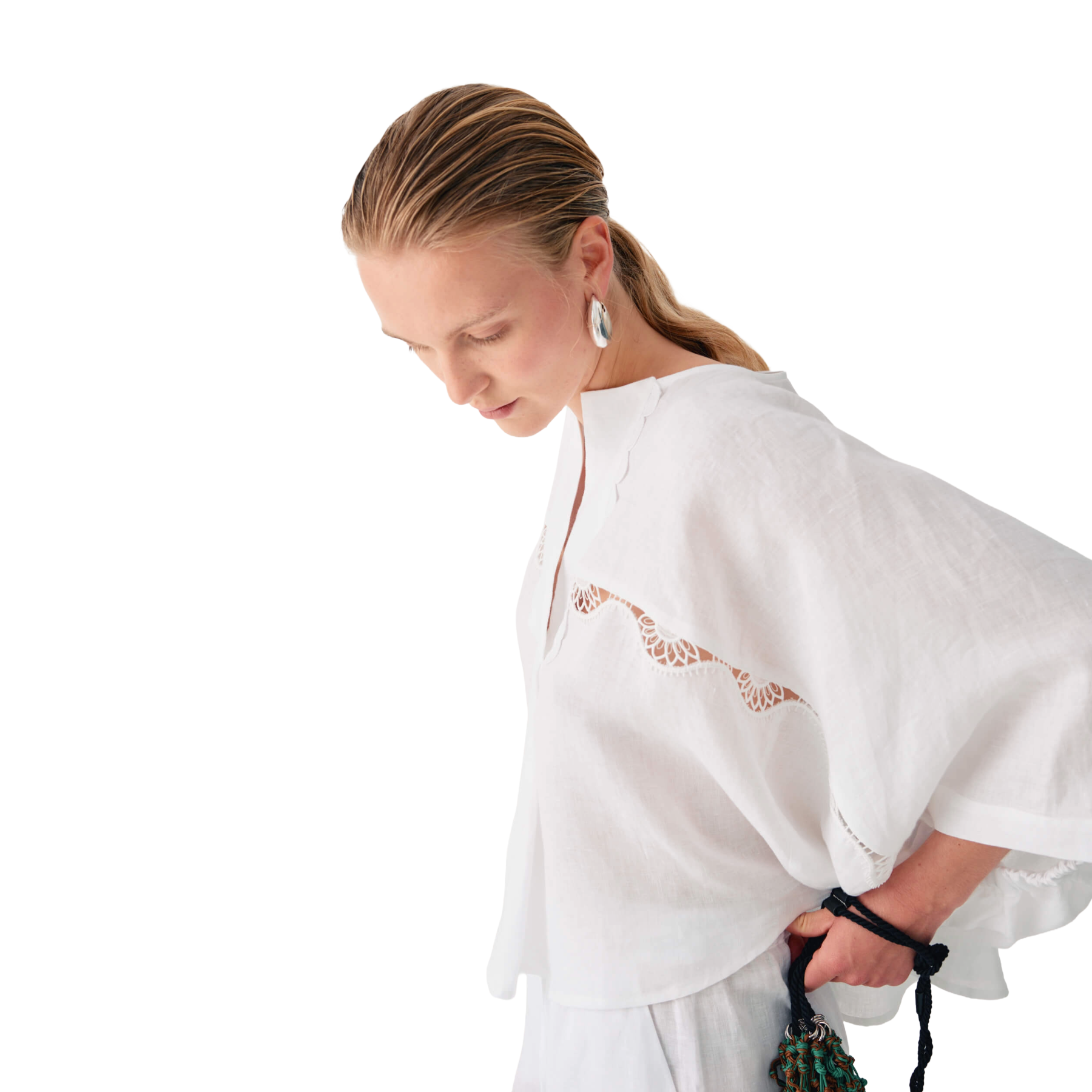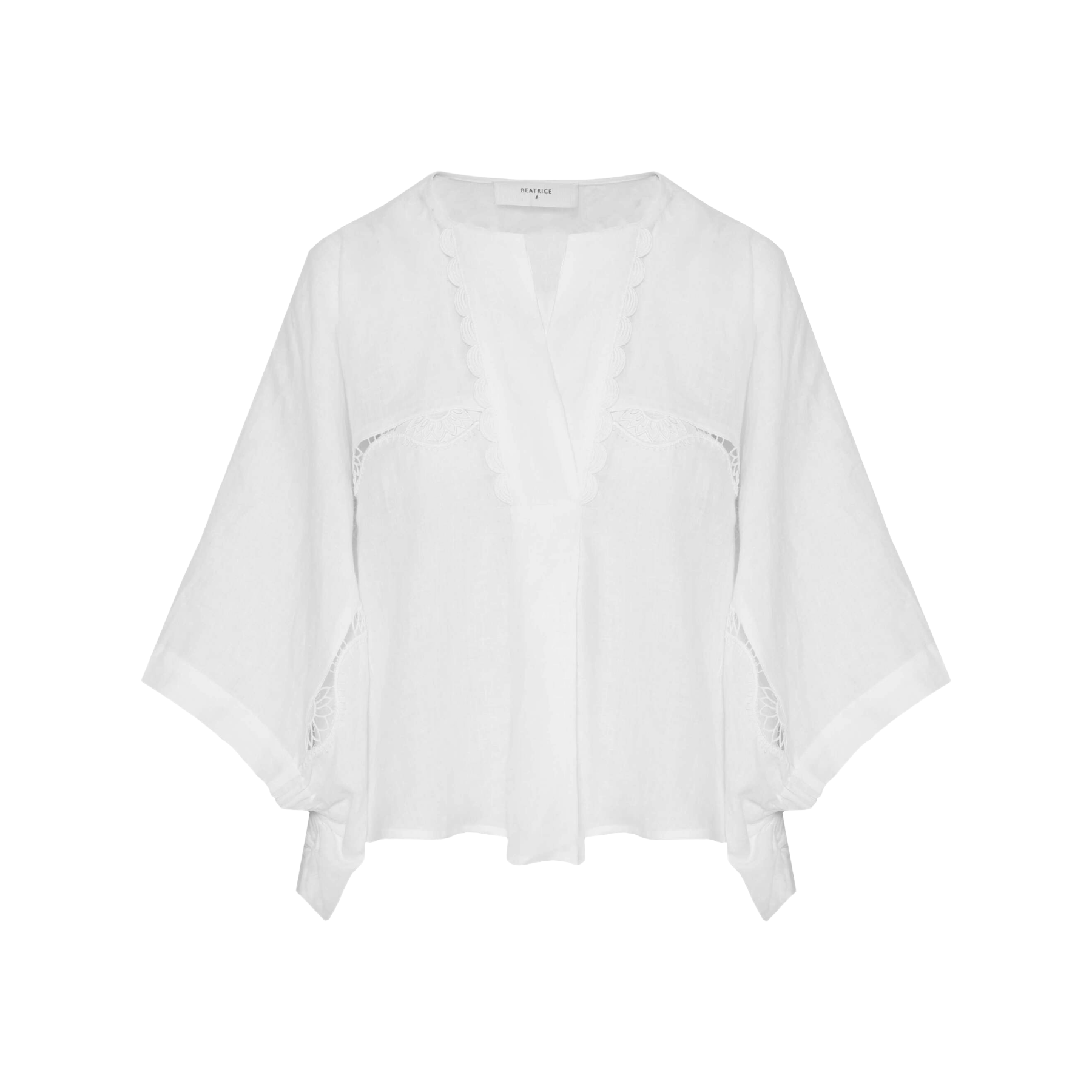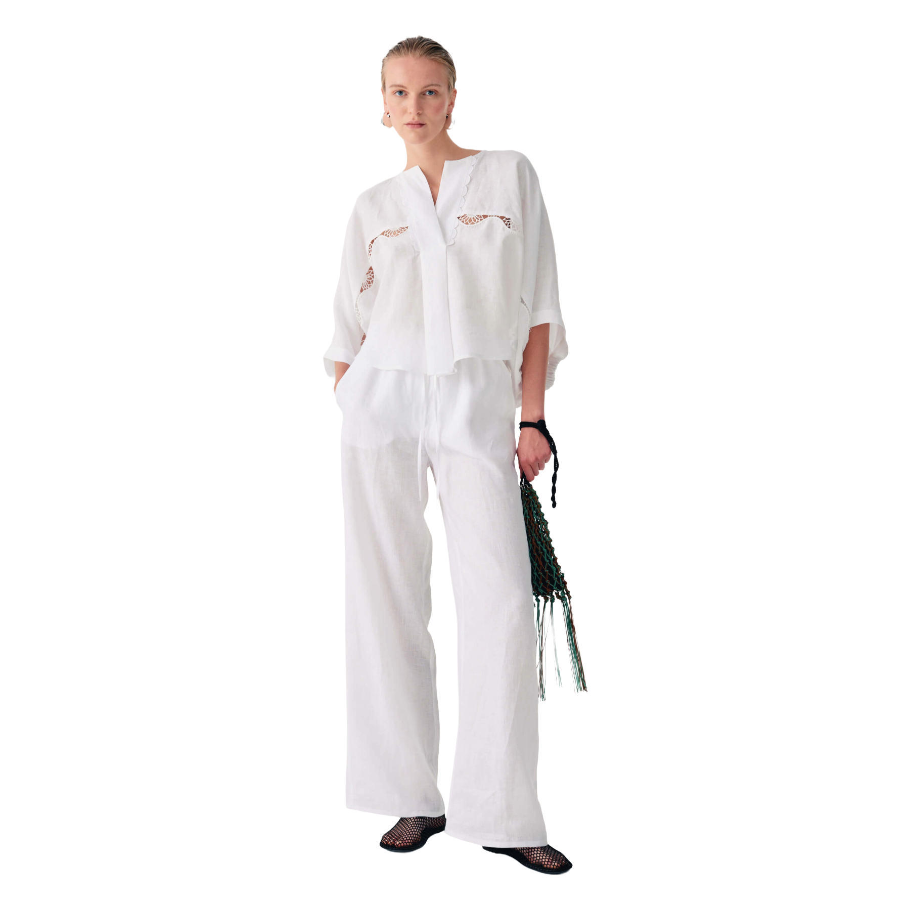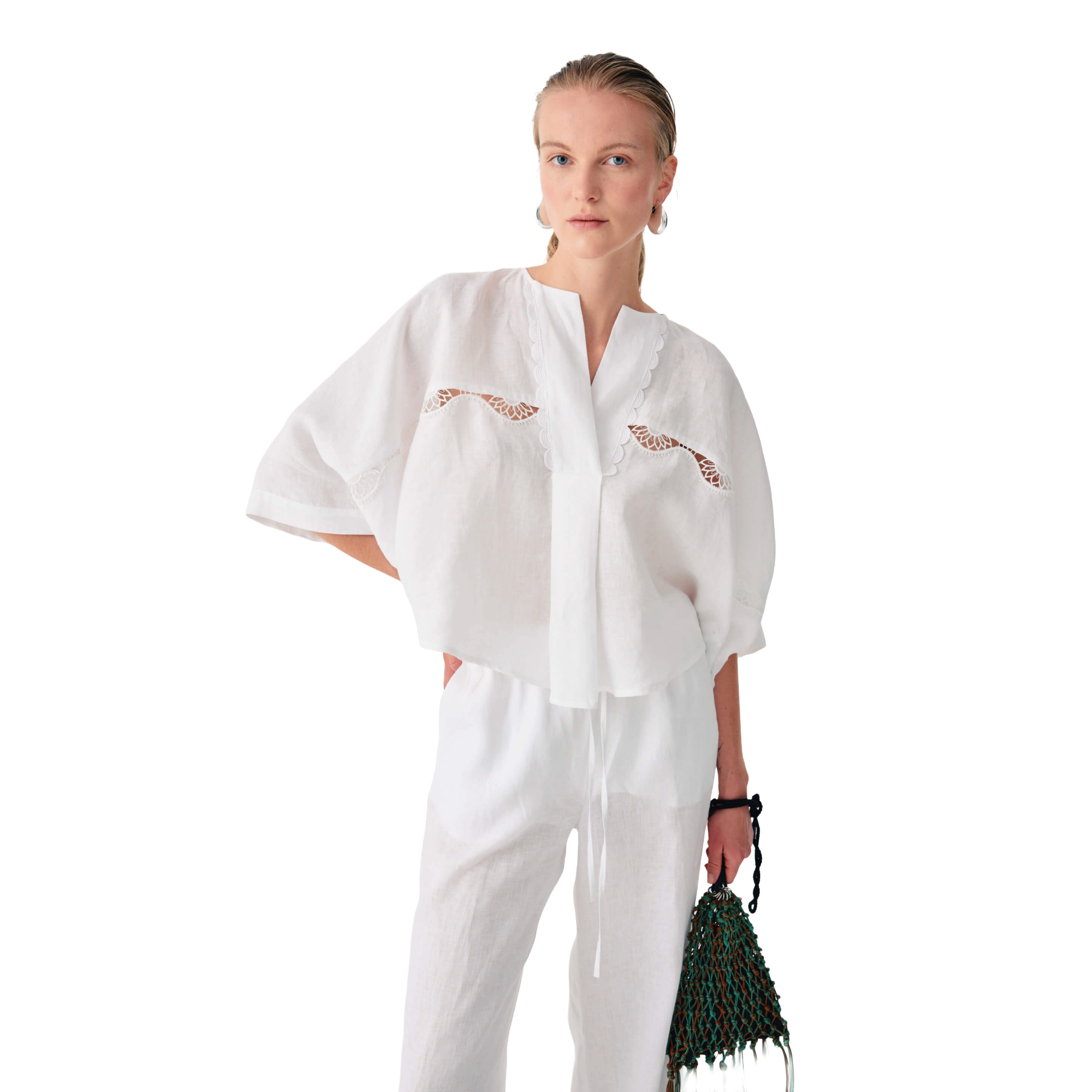 Crafted from linen, this blouse features a modern and feminine silhouette. It features a crew neckline with a front opening and three-quarter-length kimono sleeves with tone-on-tone lace. Perfect when paired with its matching trousers to elevate the look. Made in Italy.