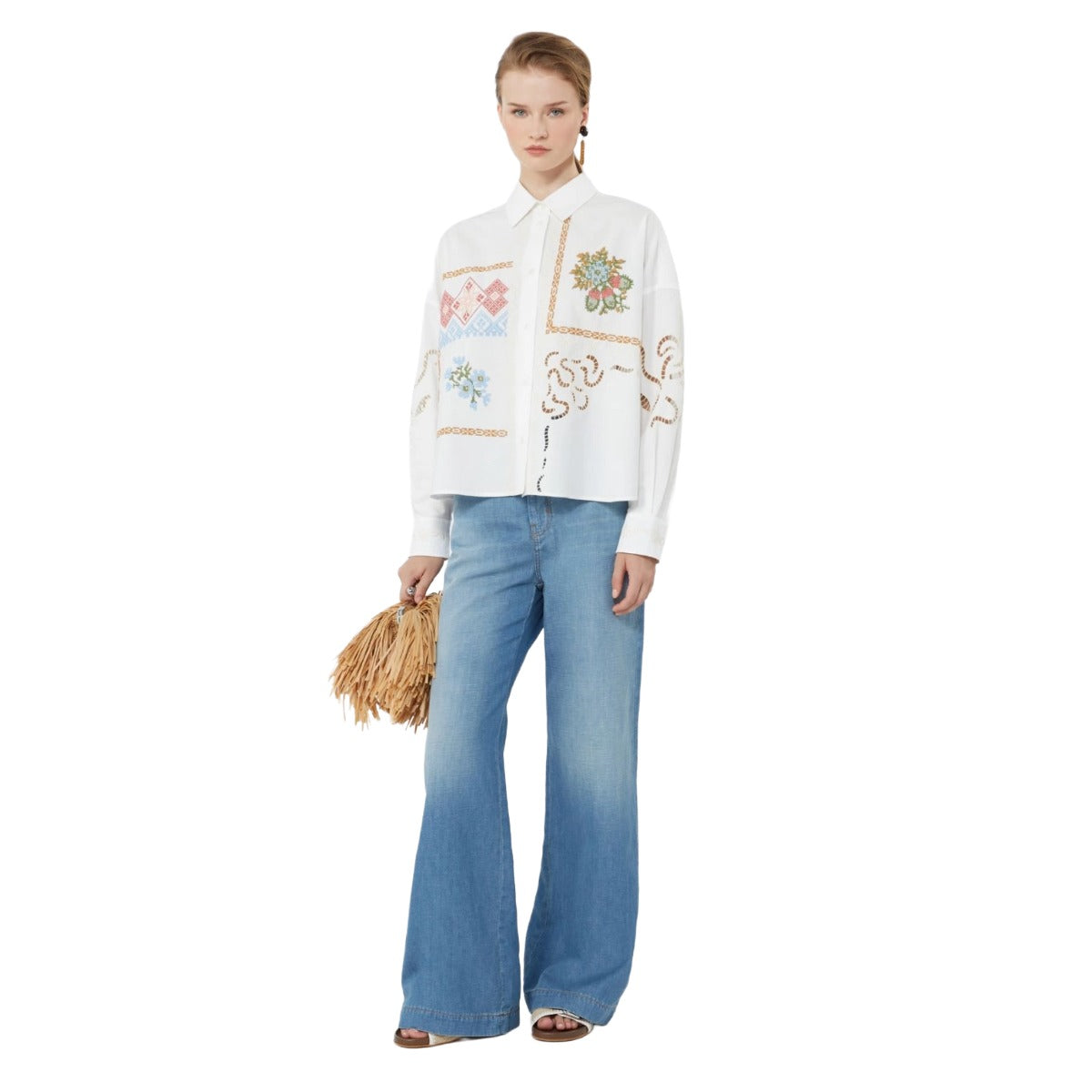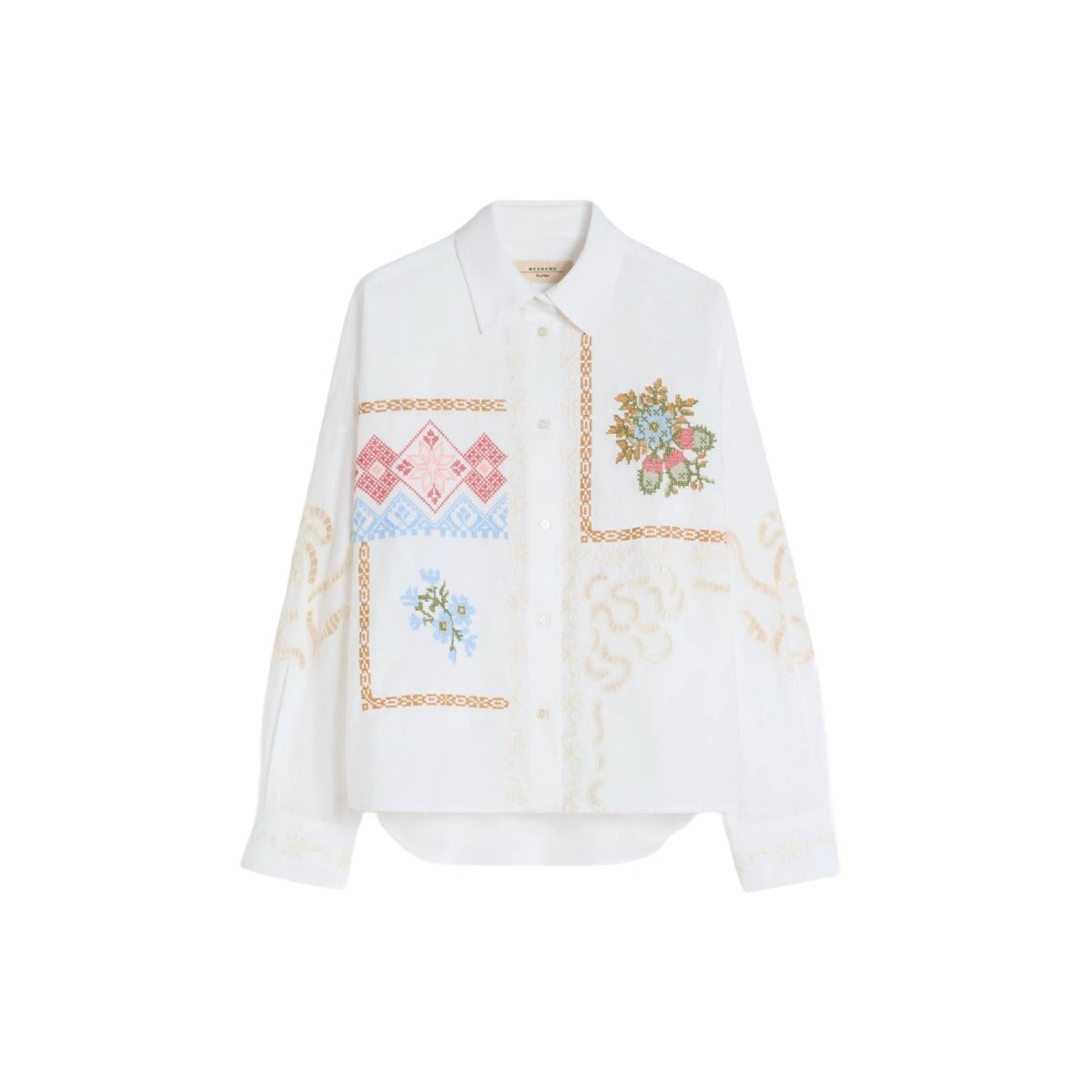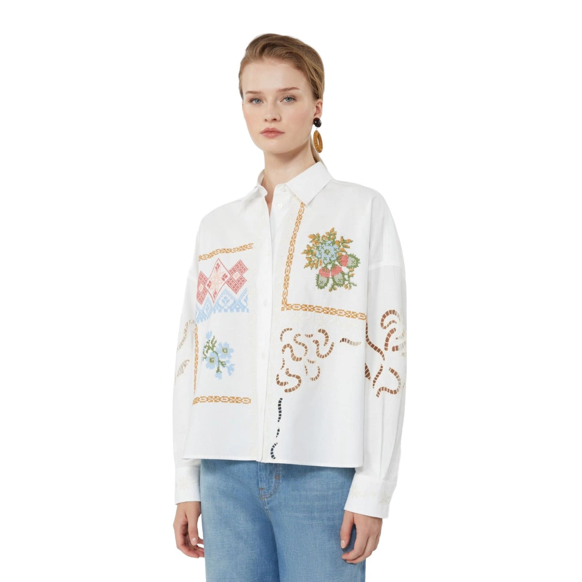 Cropped long-sleeved shirt, embellished with floral cross-stitch embroidery and Sangallo lace details. Boxy fit. Pure cotton poplin shirt. Shirt collar and cuffs. Dropped shoulders. Front fastening with visible buttons. Yoke cut with double pleat at the back. Rounded hem.