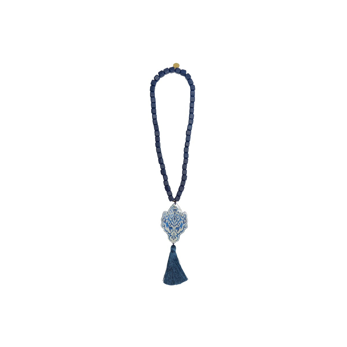Maxi necklace composed of cubic elements and a handmade resin pendant featuring the collection's graphics. The design is completed with a tone-on-tone maxi tassel for an elegant and harmonious effect. A statement piece of jewelry, to be worn like a work of art.