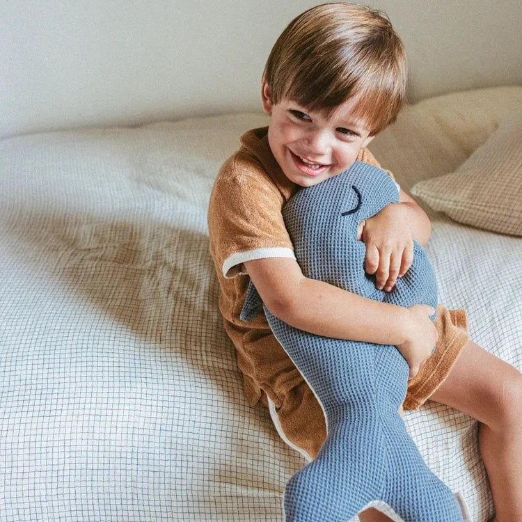 Ready to dive into an ocean of adventure with your son or daughter? Our blue whale cushion is the ideal companion. The honeycomb texture adds a unique tactile dimension, stimulating curiosity and the sense of touch. Whale adds a playful and aesthetic touch to the bedroom, inviting you to travel to a world of imagination. We love the graphic touch of the Grid printed double gauze. Shaped cushions in children's bedrooms go beyond simple decoration. They play a key role in a child's development, offering both physical and emotional support, while stimulating their imagination and learning.
