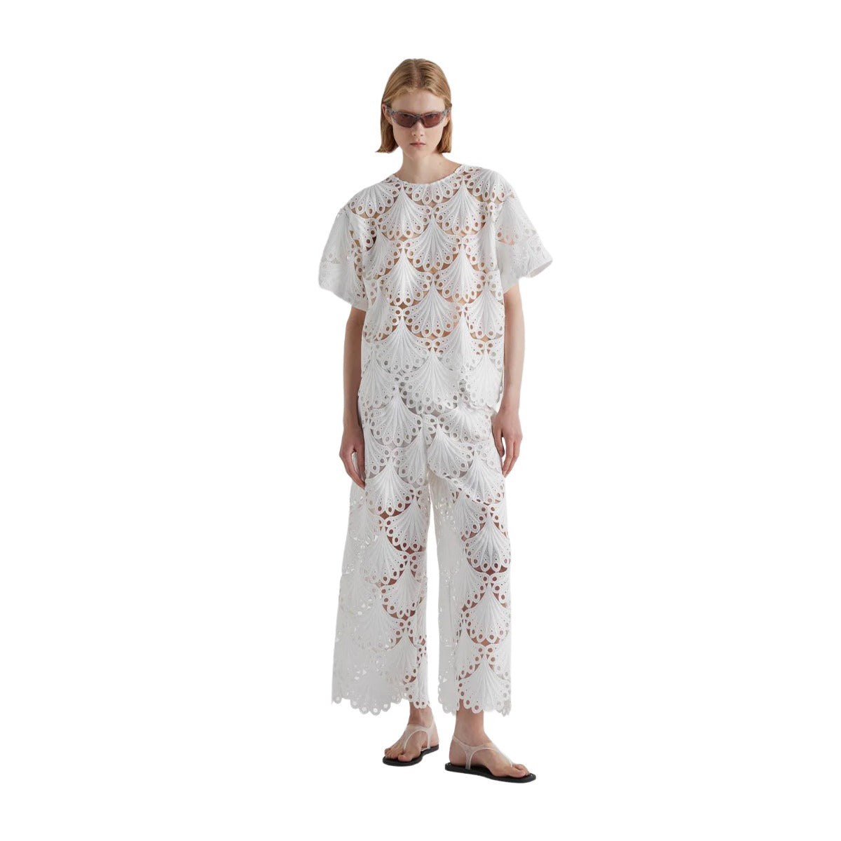 STRAIGHT-LEG TROUSERS WITH SCALLOPED HEM. INVISIBLE ZIP CLOSURE AT THE BACK.