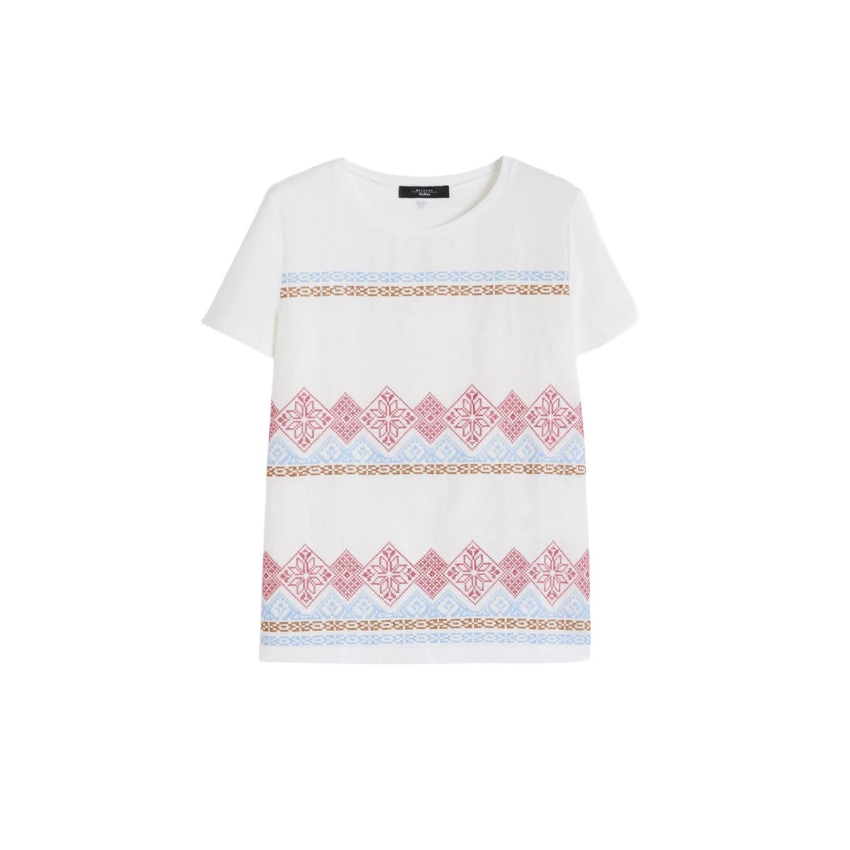 Straight-fit T-shirt, featuring a front insert in embroidered pure linen canvas. Regular fit. Stretch cotton jersey T-shirt. Crew neck. Set-in short sleeves. Small butterfly logo on the back of the neck.