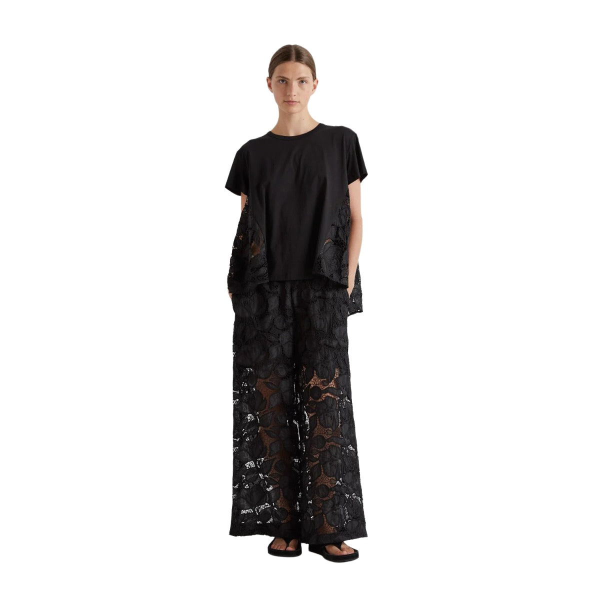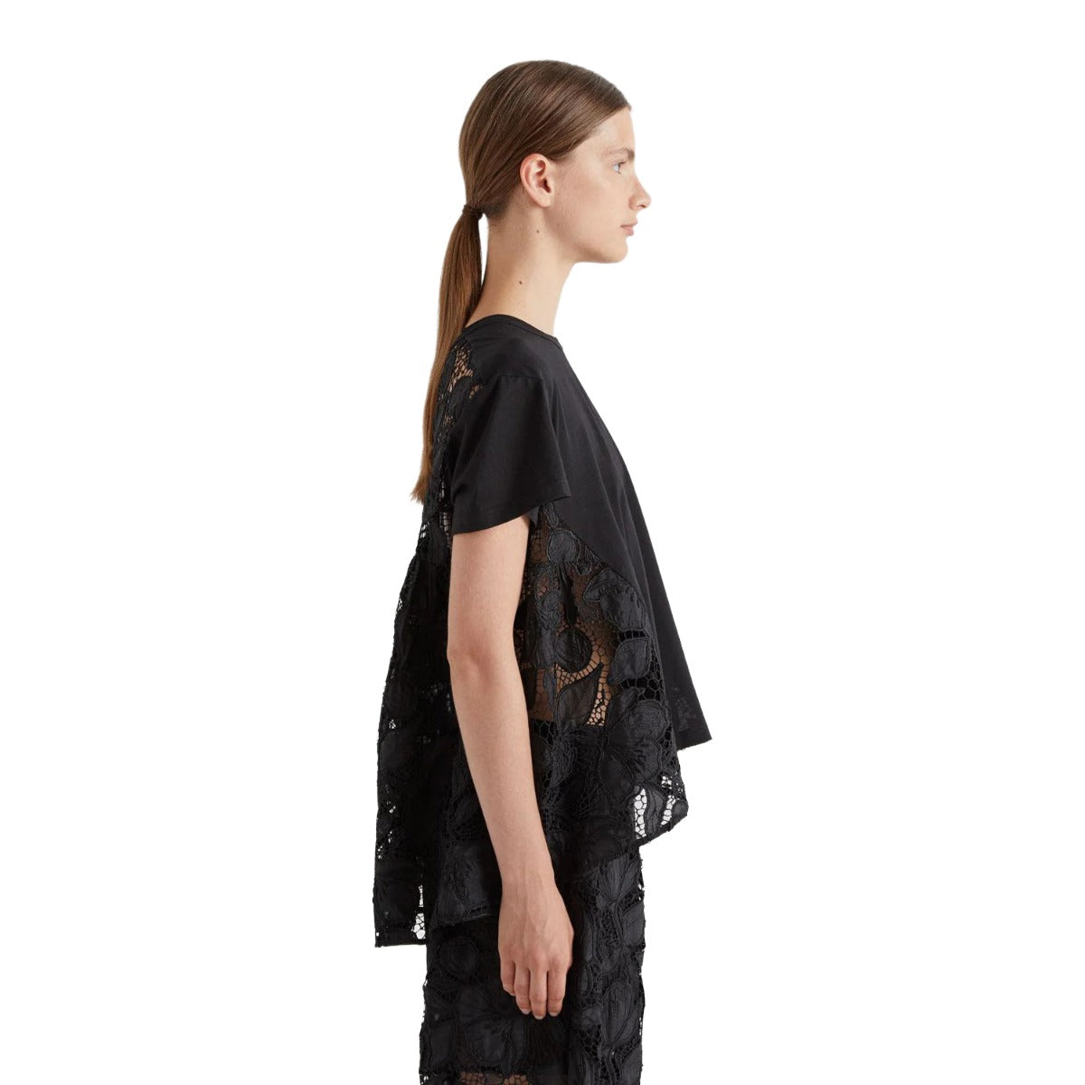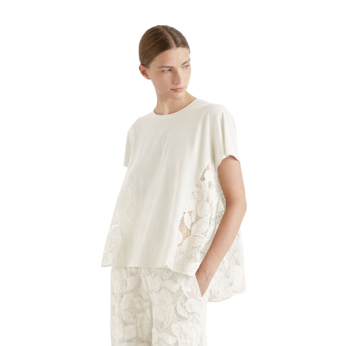 SHORT SLEEVE CREW NECK T-SHIRT. MACRAME' FABRIC INSERT ON BACK AND SIDE PANELS.