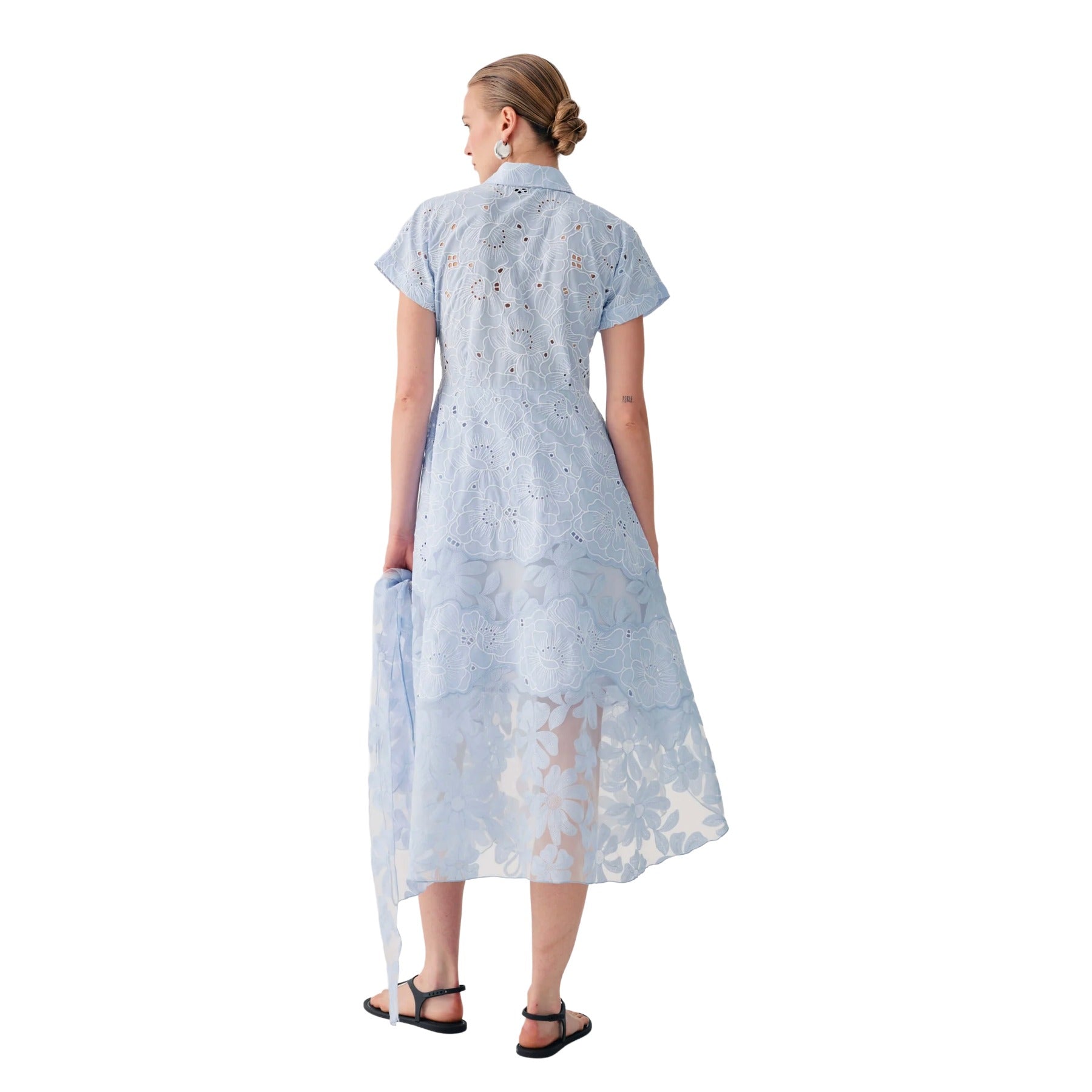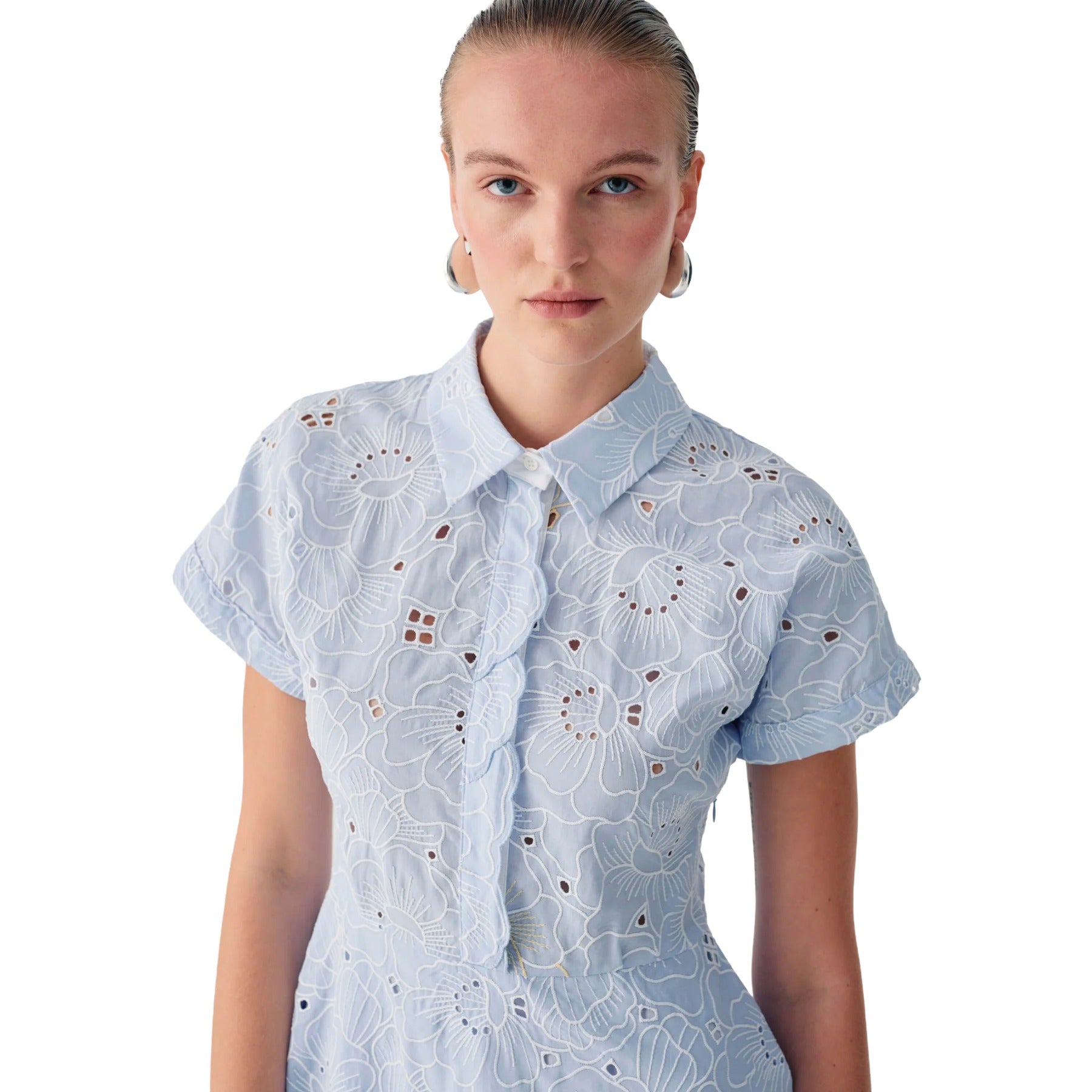 Abito chemisier in pizzo sangallo con maniche corte, colletto classico e cintura in vita. La linea svasata e il motivo floreale aggiungono leggerezza e femminilità al look. Prodotto in Italia.