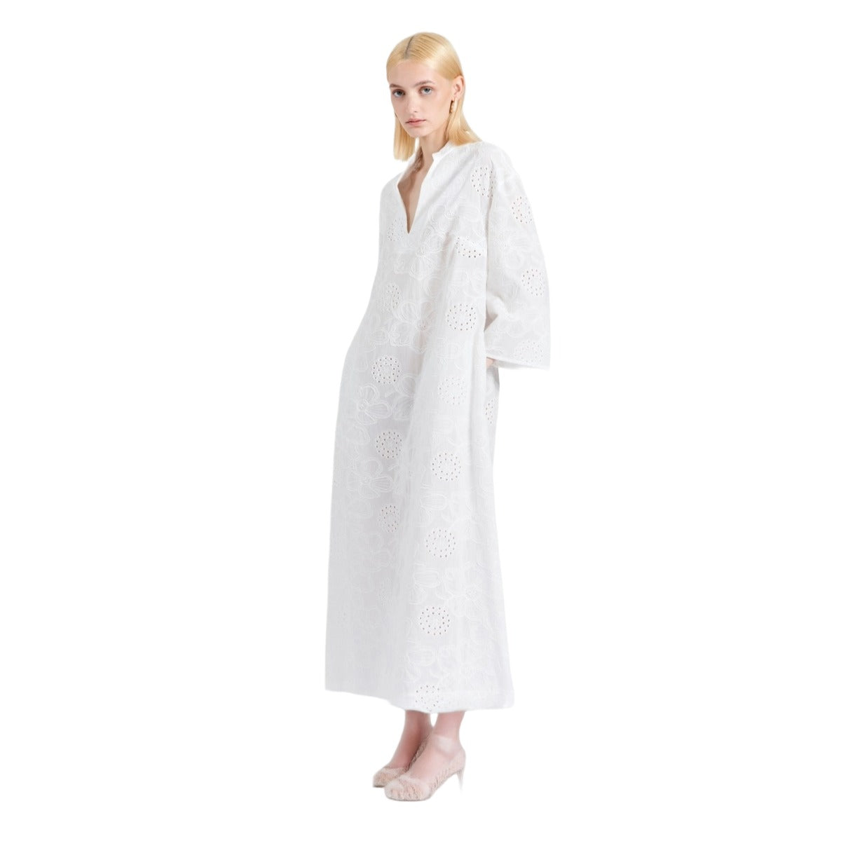 Abito lungo bianco con ricamo pieno tono su tono, scollo a V e maniche ampie. Elegante, leggero e femminile, perfetto per look estivi raffinati.