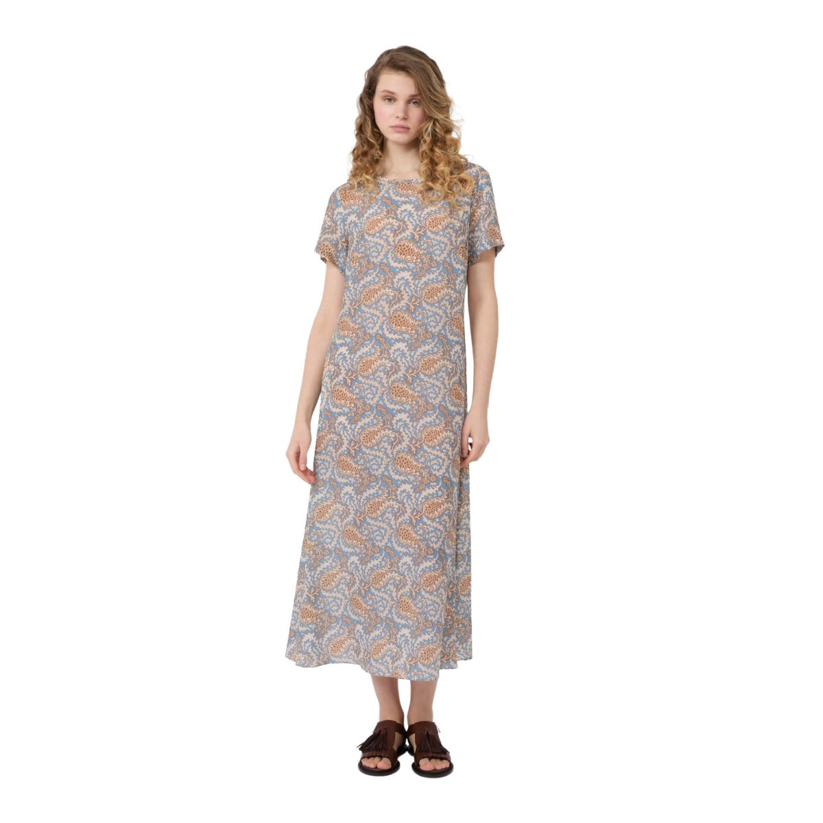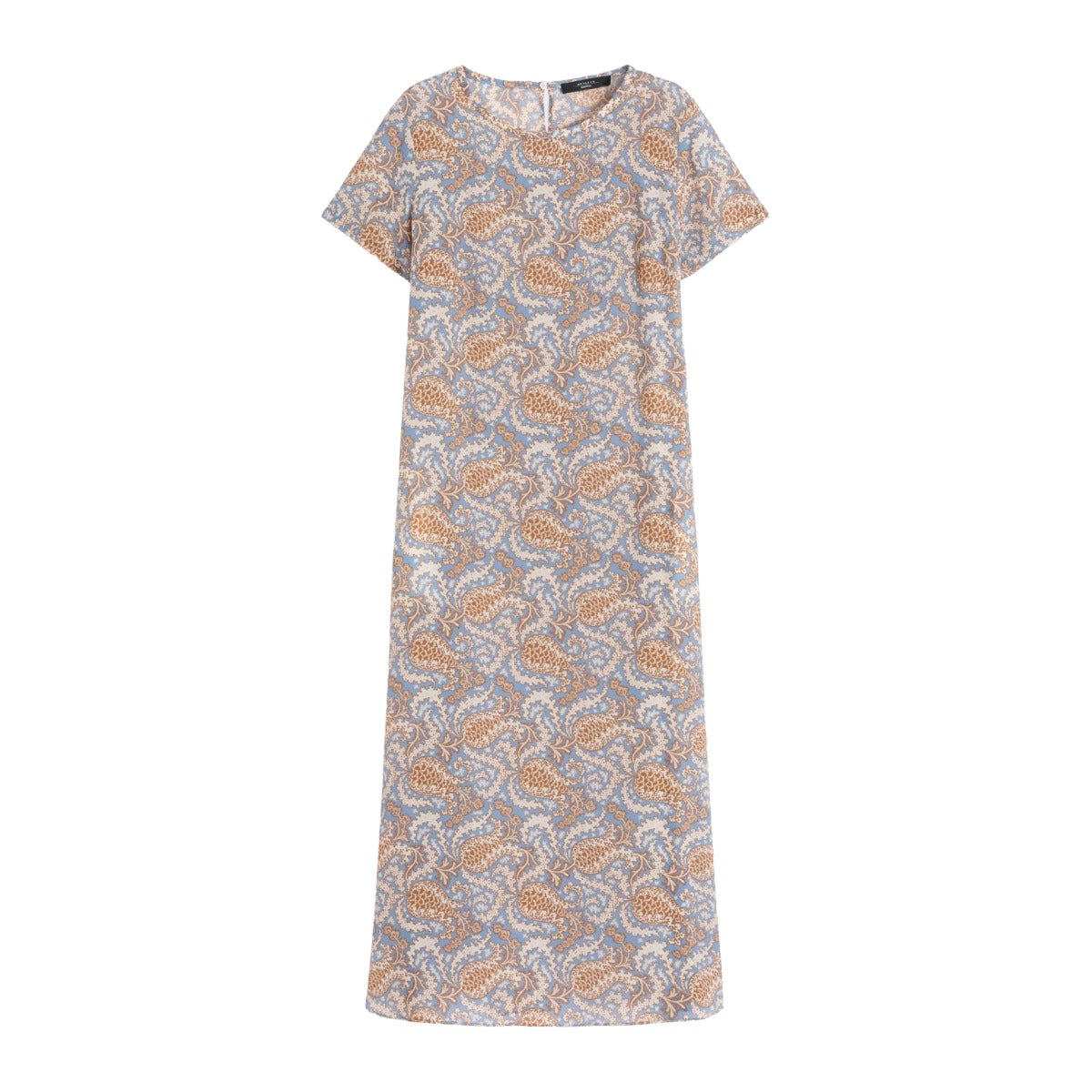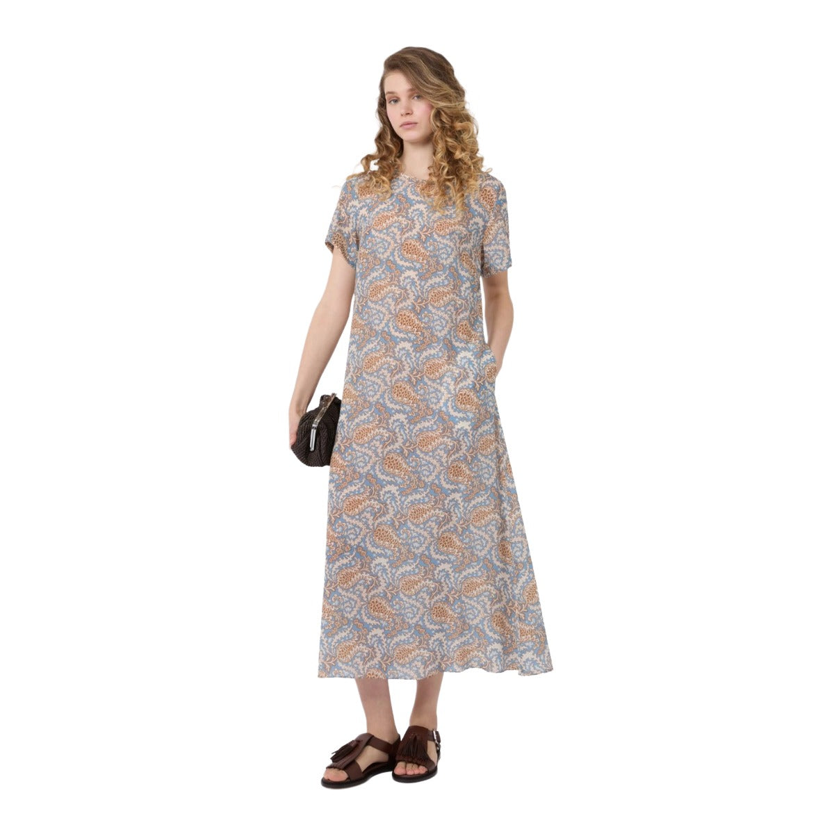 Vestibilità regular. Abito in crêpe de Chine di pura seta stampata. Girocollo. Maniche corte a giro. Chiusura a goccia con bottone sul retro. Tasche inserite nei fianchi. Sfoderato.