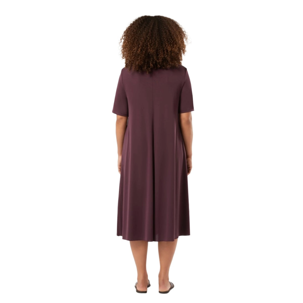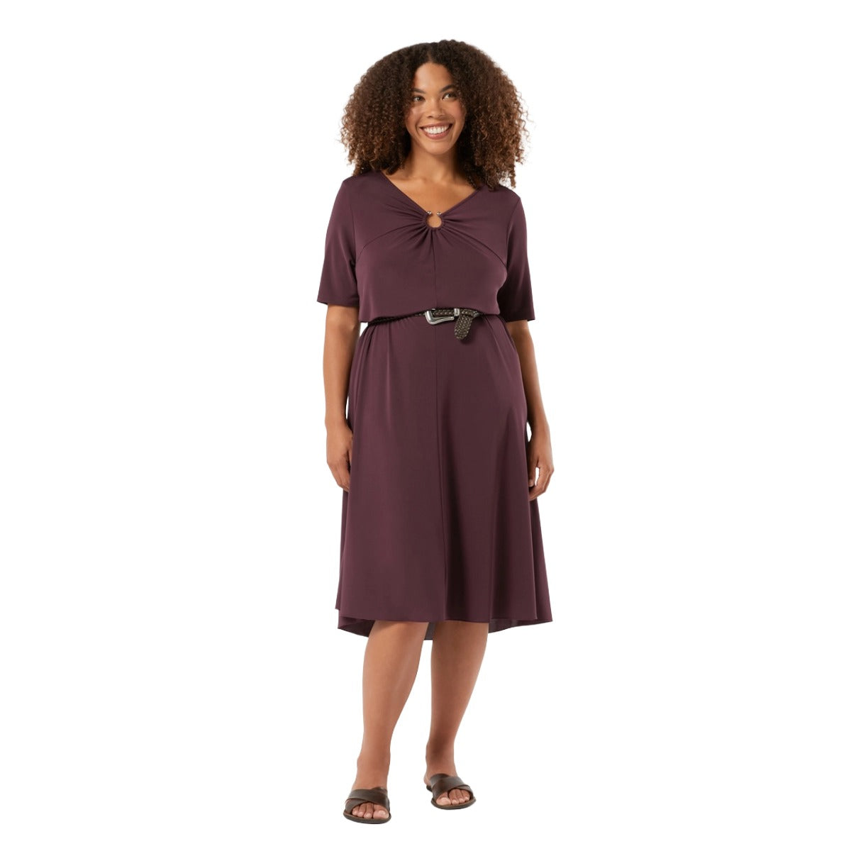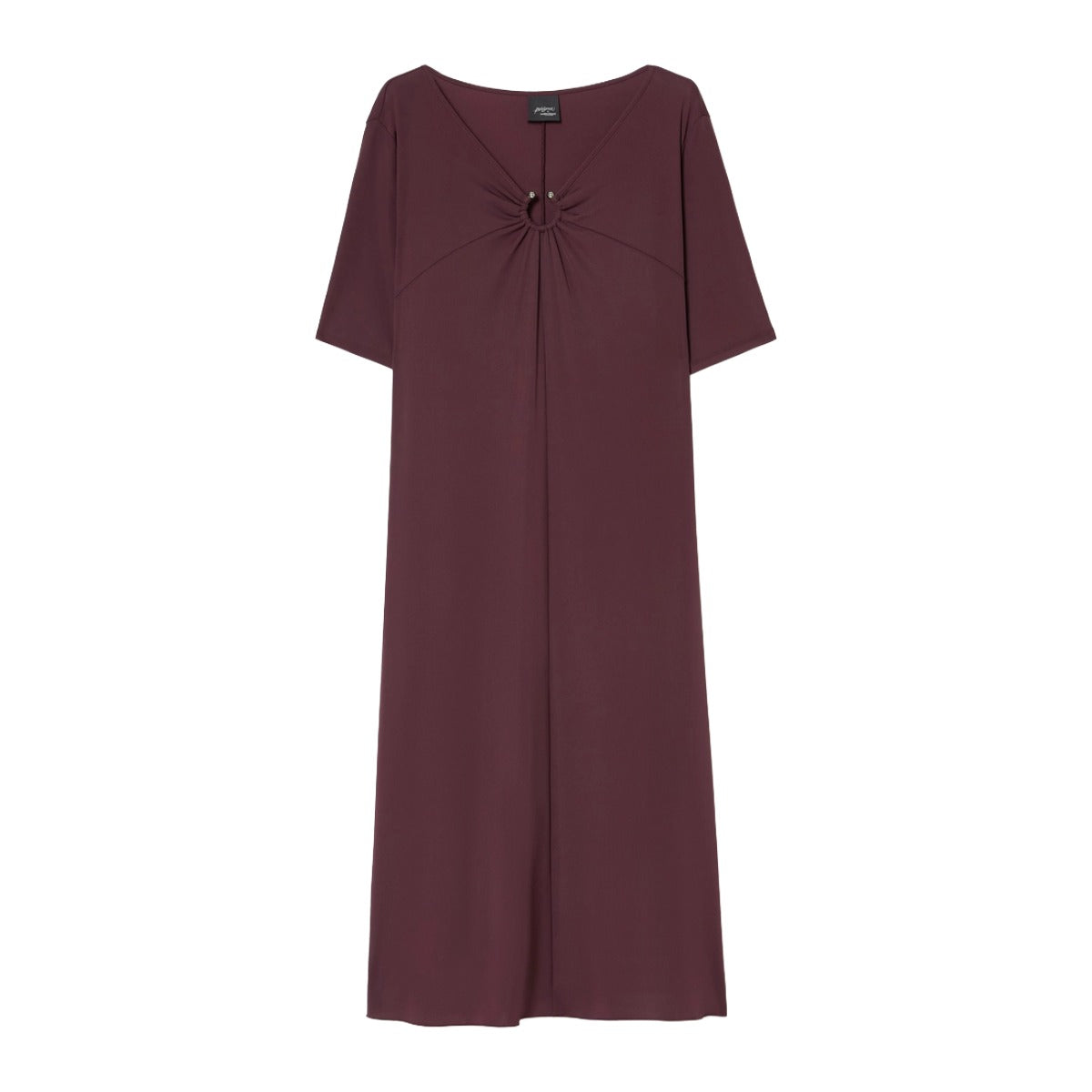 Comfort e femminilità s'incontrano nell’abito in jersey dalla linea morbida, con scollo a V e anello in metallo che crea un motivo drappeggiato davanti.