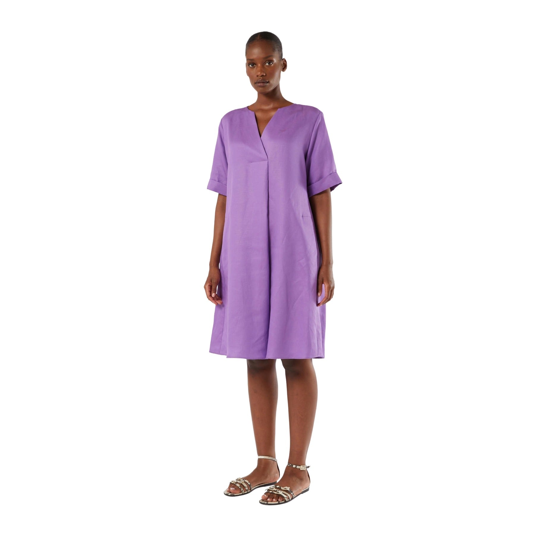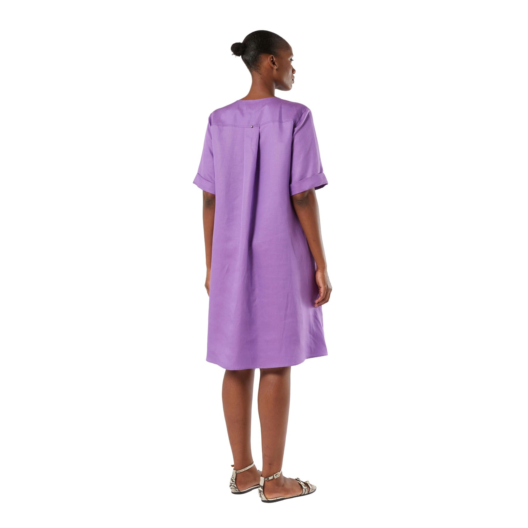 Per i tuoi look quotidiani scegli l'abito midi in twill di lino e tencel, dalla linea svasata. Scollatura a v sovrapposta, piega davanti, maniche corte con risvolto e tasche inserite ai fianchi. Con scarpe flat o tacchi alti a seconda del mood. Il capo fa parte della collezione Marina Sport.