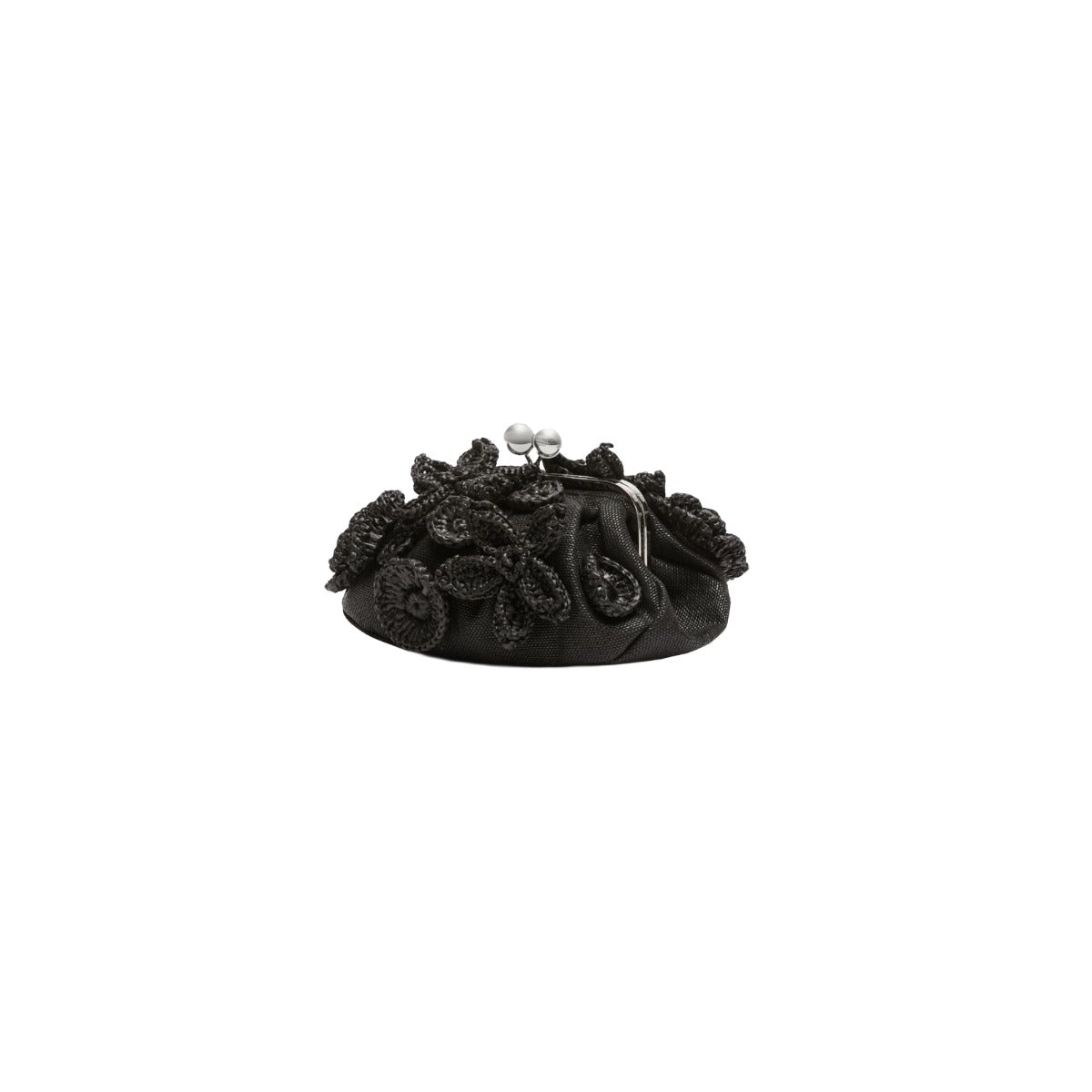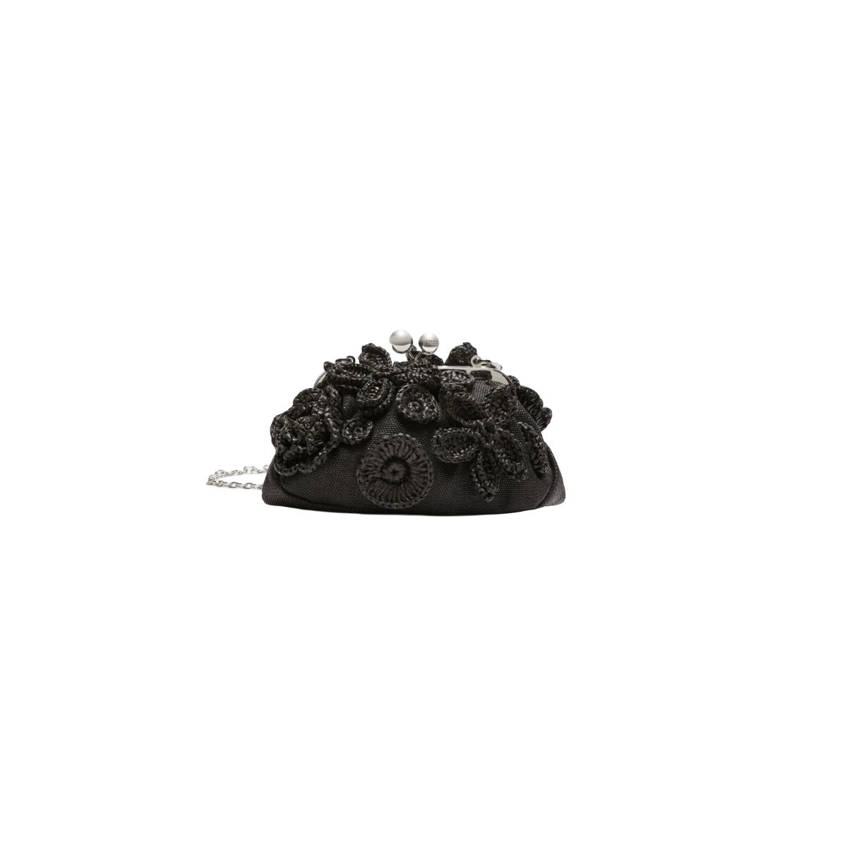 Pasticcino Bag small, la super clutch per dare un tocco personale e affascinante al tuo stile quotidiano. Borsa in tessuto intrecciato effetto rafia. Fiori 3D di diversi forme e dimensioni applicati all over. Fodera in tessuto a righe con label personalizzata. Tracolla lunga rimovibile a catena con spallaccio in pelle. Chiusura metallica con sfere personalizzate Weekend Max Mara.