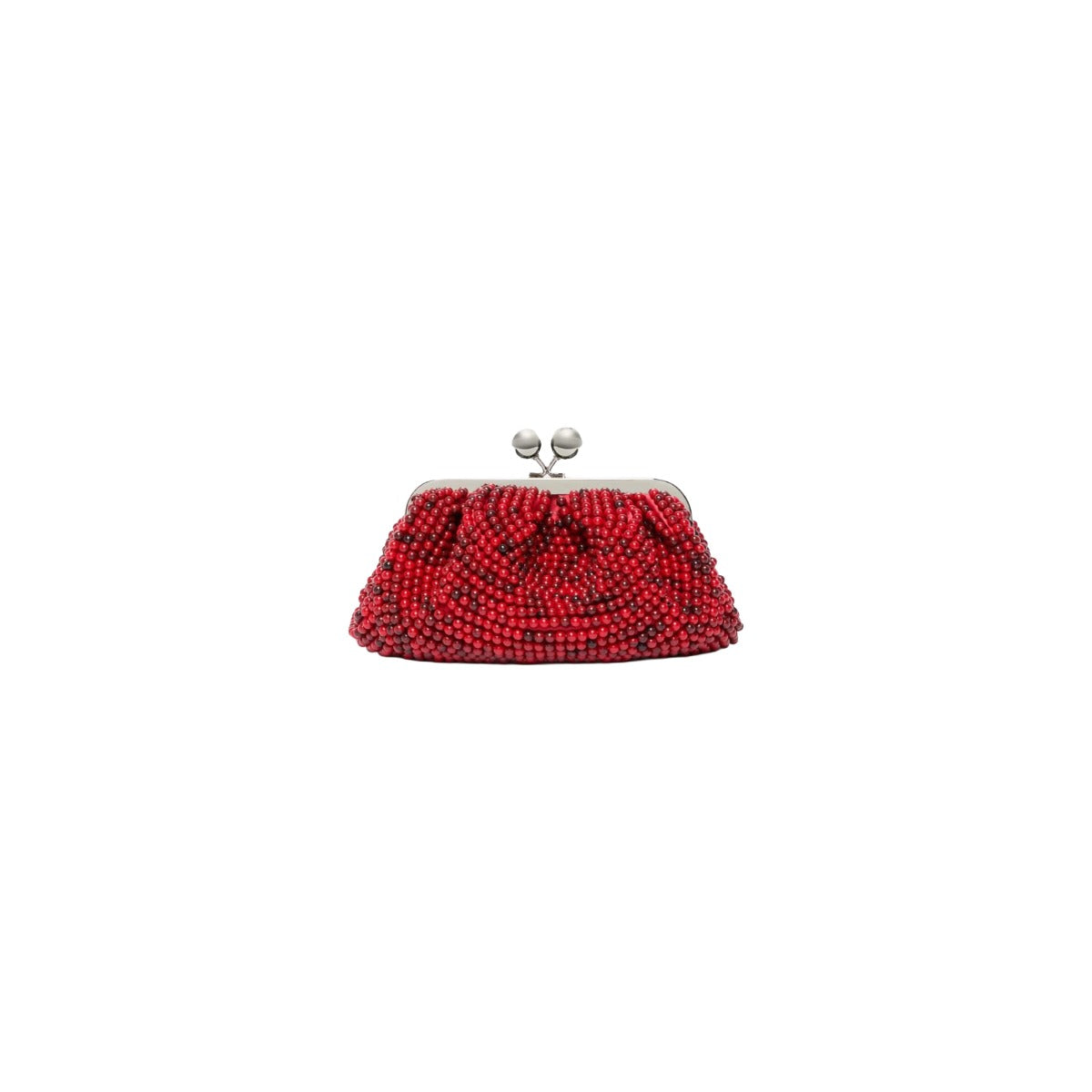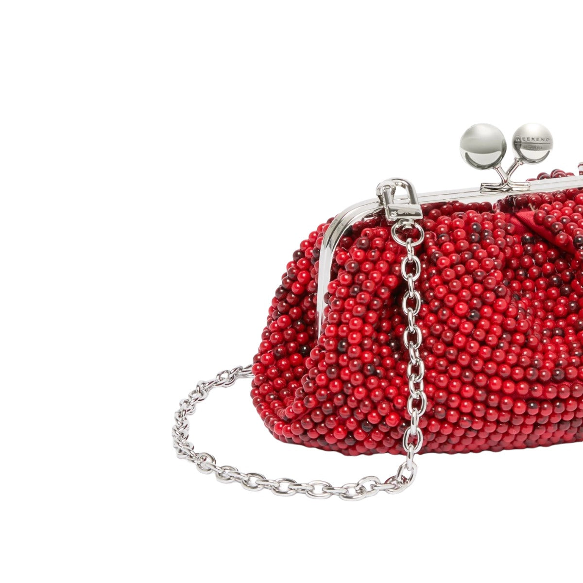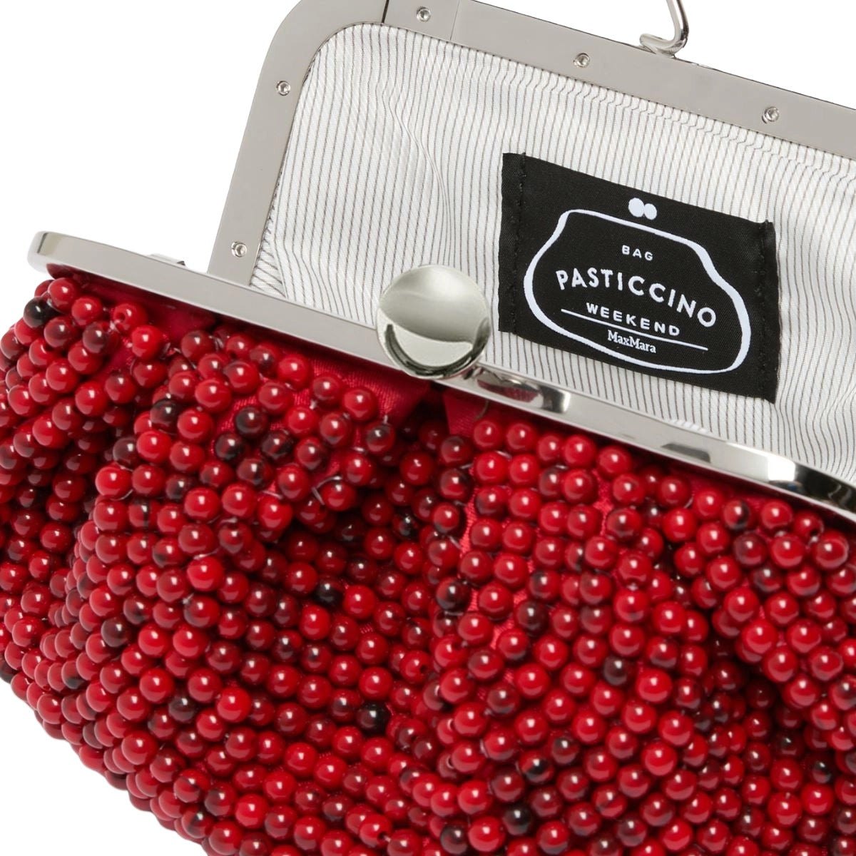Pasticcino Bag small, la super clutch per dare un tocco personale e affascinante al tuo stile quotidiano. Borsa in raso, interamente ricoperta da perle in resina ricamate. Leggermente imbottita. Fodera in tessuto a righe con label personalizzata. Tracolla lunga rimovibile a catena con spallaccio in pelle. Chiusura metallica con sfere personalizzate Weekend Max Mara.