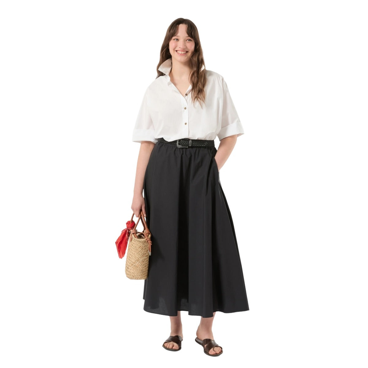 Camicia in cotone unito, dalla linea boxy a maniche corte con risvolto cucito, giromanica sceso, chiusura con bottoni, carrè con contropiega sul retro e spacchetti laterali arrotondati.