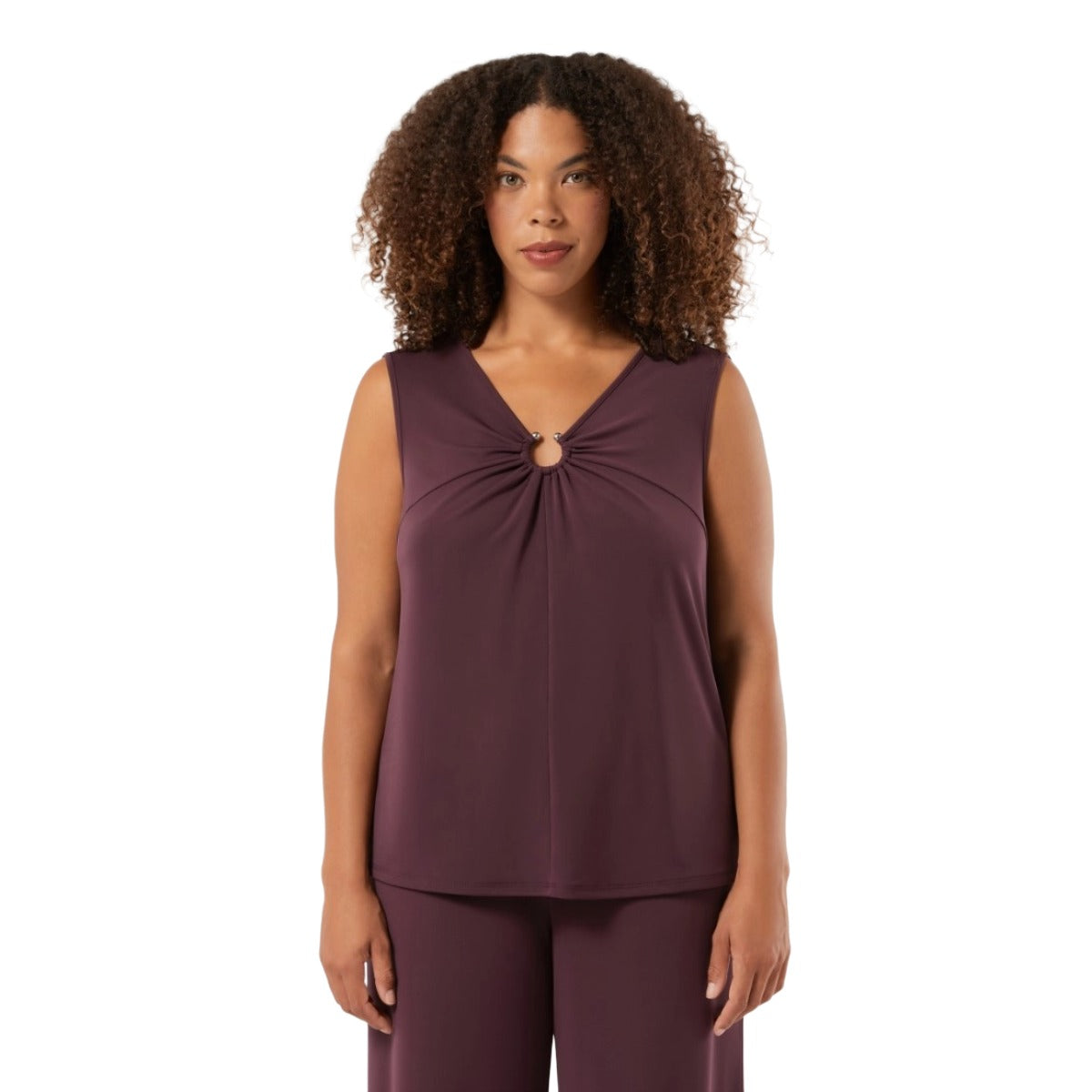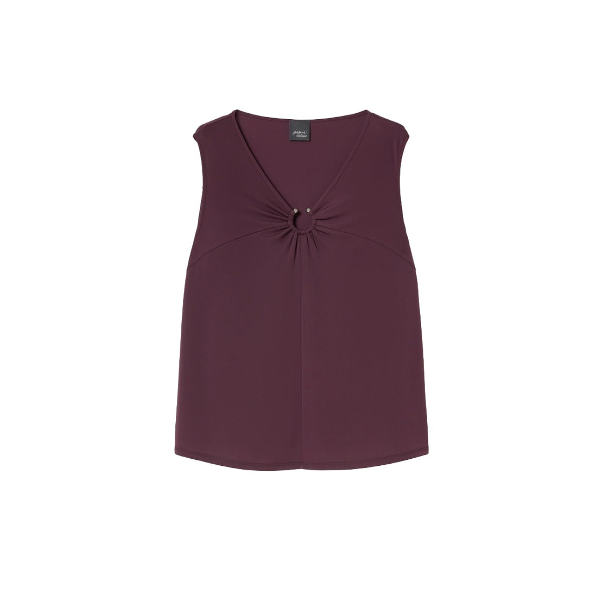 Un motivo drappeggiato dona carattere alla canotta in jersey interlock, con scollo a V. Design funzionale e raffinato allo stesso tempo. Jersey interlock. Linea dritta. Scollo a V con anello in metallo rimovibile. Motivo drappeggiato davanti.