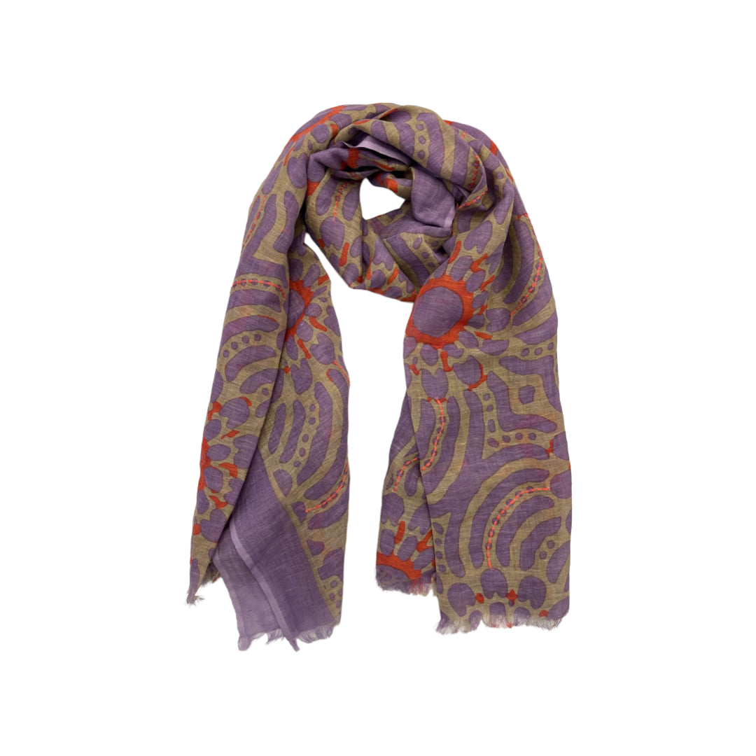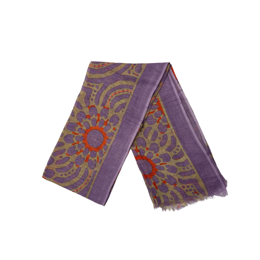 Sciarpa in cotone/lino stampata con ricamo Up&Down, sfrangiata a mano sui lati corti.